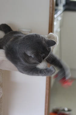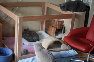 Dit weekend heb ik de box opgeruimd. De vijf hebben nu de hele dag de woonkamer en keuken tot hun beschikking en vinden dat maar wat fijn. Lekker rennen, maar vooral ook heerlijk liggen in een van de hangmandjes van de klimpalen, liefst met Nanoesch tussen hun in.