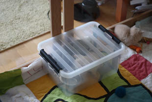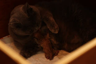 De kittens groeien inmiddels goed, en zijn heel tevreden. Dat is Xeline nu ook weer, nadat zij gisteren een nieuw plekje voor haar kindjes had uitgezocht...Daar ligt ze nu in een geleende werpkist, die bijna helemaal dicht kan, wat echt ideaal voor haar is. Sindsdien heeft ze niet meer gesleept. Ze is ook weer relaxed en komt regelmatig knuffeltjes halen of spelen met haar hengeltje.,