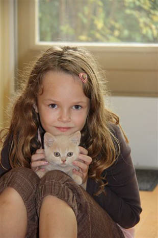 Via een advertentie in het wijkkrantje (ruim 20 reacties!) heb ik voor de dagen dat ik werk 2 vrouwen, Joke en Marie-An ‘aangenomen’ die ombeurten tussen de middag een uurtje de kittens komen vertroetelen zodat ze geen aandacht tekort komen. Dit gaat hastikke goed en het is voor mij een heel rustig idee dat de kittens bij hen in goede handen zijn. Nu de kittens wat groter zijn neemt Marie-An regelmatig haar beide dochtertjes Fay en Flore mee. De meiden vinden de kittens geweldig en er wordt druk met ze gespeeld. Gisteren kreeg ik een aantal foto’s van Marie-An. Speeluurtje op het Kopstuk: